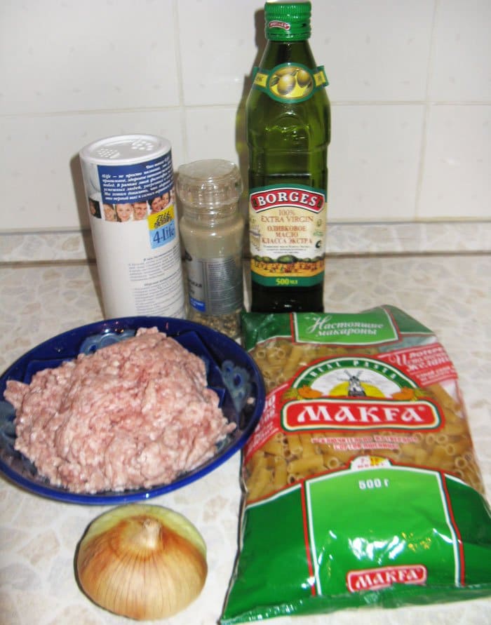 Добавить к фаршу макароны, посолить, поперчить, перемешать, жарить 2-3 минуты.